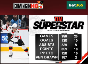 Stutzle is set to become the 25th player to reach the 400 game mark as a member of the Ottawa Senators franchise. He is regarded as one of the most skilled players ever to wear a Sens sweater. Furthermore, that’s not to mention his standing as one of the most skilled players in the NHL right now. As you can see by the graphic below, it is quite impressive how high the 23-year-old German is on the franchise all-time lists. He appears in the top ten already in goals, assists, and points (power play and total).